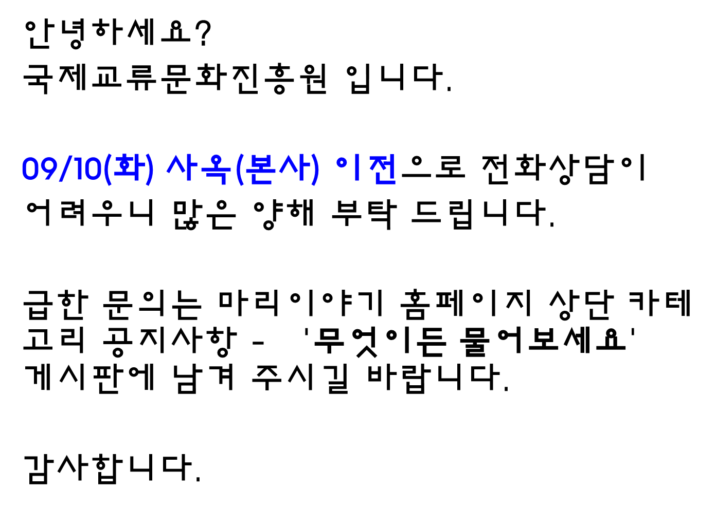 09/10(È) »ç¿ÁÀÌÀüÀ¸·Î »ó´ãÀüÈ ºÒ°¡ ¾È³»