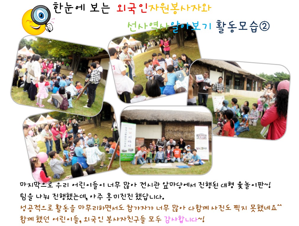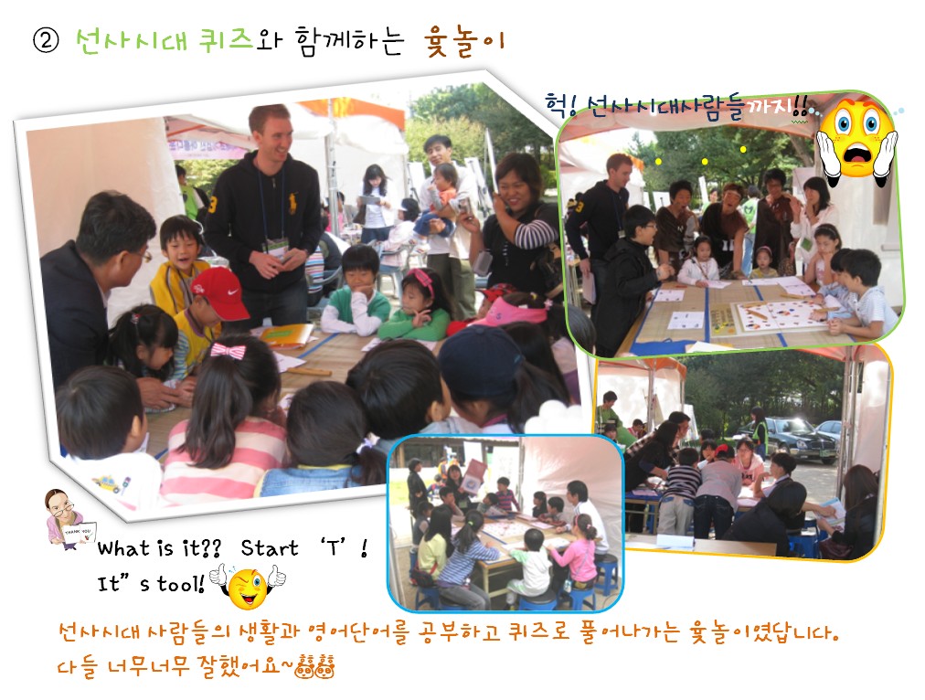 ÃàÁ¦°¡ ÁøÇàµÈ ÀÌÆ² µ¿¾È 200¿© ¸íÀÇ ¾î¸°À̵éÀÌ 15¸íÀÇ ´ëÇлý ÀÚ¿øºÀ»çÀÚµé°ú ÇÔ²² À·³îÀ̸¦ ÇÏ¸ç ¾Ï»ç ¼±»çÁÖ°ÅÁö¿¡ °ü·ÃµÈ Áß¿äÇÑ ¿µ¾î´Ü¾î¸¦ ¹è¿ì°í, Àü½Ã°üÀ» ÇÔ²² °ü¶÷ÇÏ¸ç ¾Ï»ç ¼±»çÁÖ°ÅÁö¿Í ¿ì¸®³ª¶ó ¼±»ç½Ã´ëÀÇ ¿ª»ç¸¦ ¿µ¾î·Î ¹è¿ì´Â ½Ã°£À» °¡Á³½À´Ï´Ù.