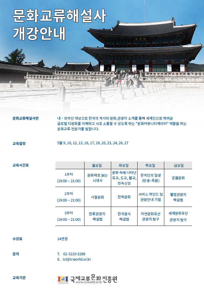 - ±³À° ÀÏÁ¤ : 2016³â 5¿ù 9, 10, 12, 13, 16, 17, 19, 20, 23, 24, 26, 27ÀÏ (ÁÖ 4ÀÏ ¿ù, È, ¸ñ, ±Ý 19:00~21:00)