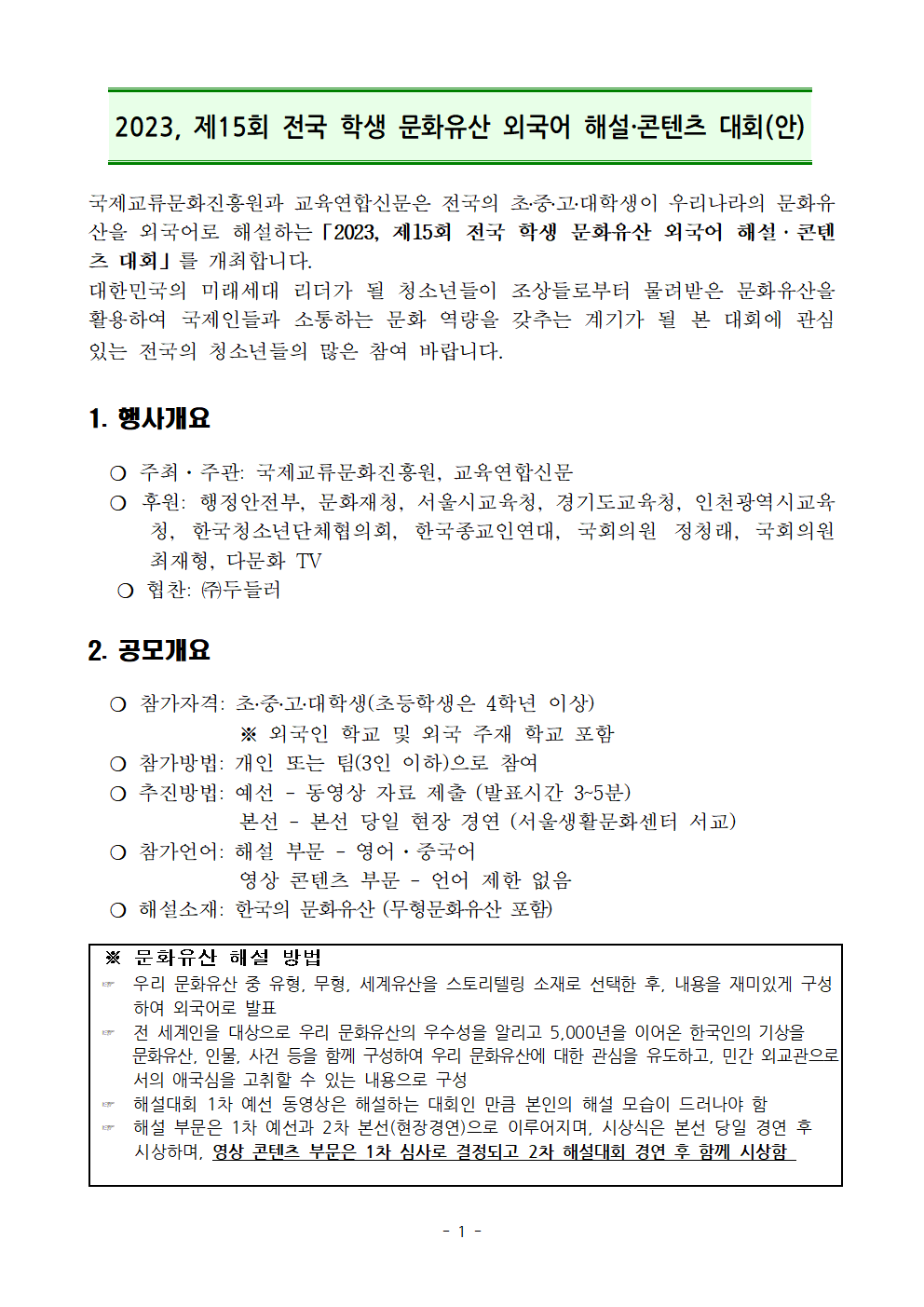ÀÚ¼¼ÇÑ »çÇ×Àº º»¹® »ó´Ü¿¡ ÷ºÎµÈ Á¦15ȸ Àü±¹ Çлý ¹®ÈÀ¯»ê ¿Ü±¹¾î ÇØ¼³¡¤ÄÜÅÙÃ÷ ´ëȸ_°ø°í_½Åû¼.hwp ÆÄÀÏÀ» Âü°í ¹Ù¶ø´Ï´Ù.