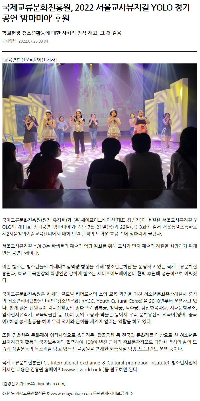 ±³À°¿¬ÇսŹ® ±â»ç - ±¹Á¦±³·ù¹®ÈÁøÈï¿ø, 2022 ¼¿ï±³»ç¹ÂÁöÄà YOLO Á¤±â°ø¿¬ ¡®¸¾¸¶¹Ì¾Æ¡¯ ÈÄ¿ø